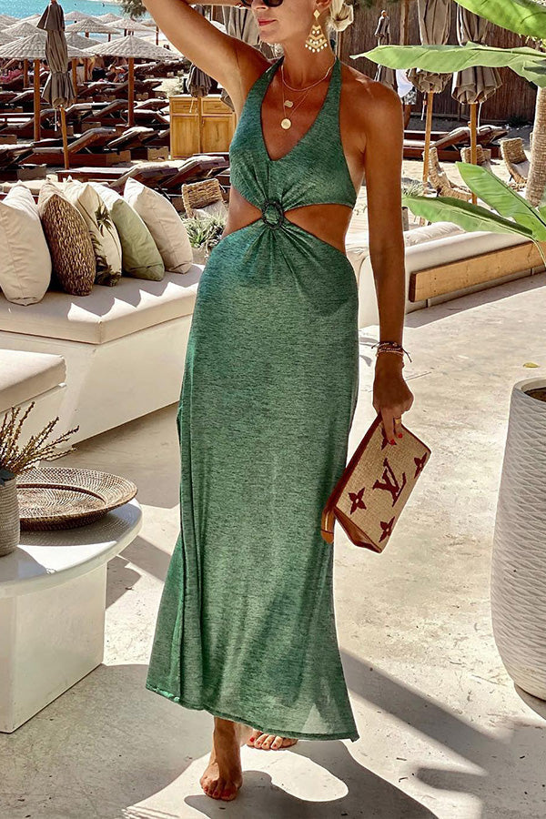 Island Covenant Ring Decorated Double Sides Open Waist Belted Resort Long Dress